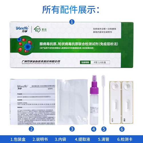 適用用途:居家自測,單人份包裝,快速檢測腺病毒、輪狀病毒。